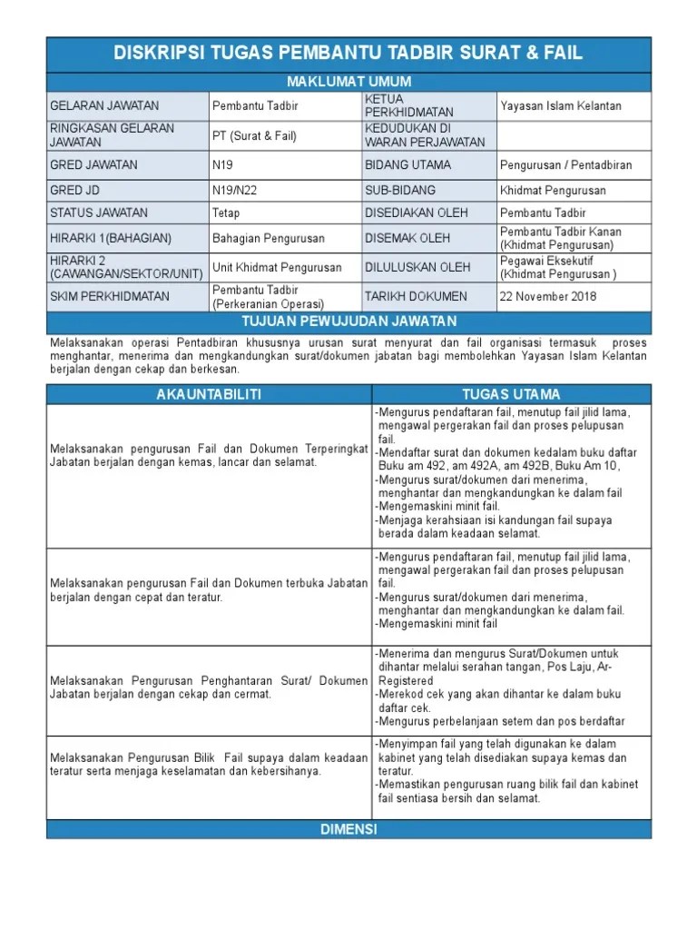 Kepada pembantu tadbir (kewangan) gred w19 yang sedang memangku gred w22 mulai 01.09.2021. Pembantu tadbir kewangan w22 · cik aida nurahmi binti ismail · encik mohd tarmizie bin adam · puan nor hayaitina binti sulaiman · cik junainah binti saad · puan erma . Skop fungsi dan bidang tugas. Berupaya melaksanakan bidang tugas jawatannya selaras dengan peraturanperaturan. Deskripsi tugas pembantu tadbir (kewangan) w19 ialah : * menyedia dan mengemaskini belanjawan .